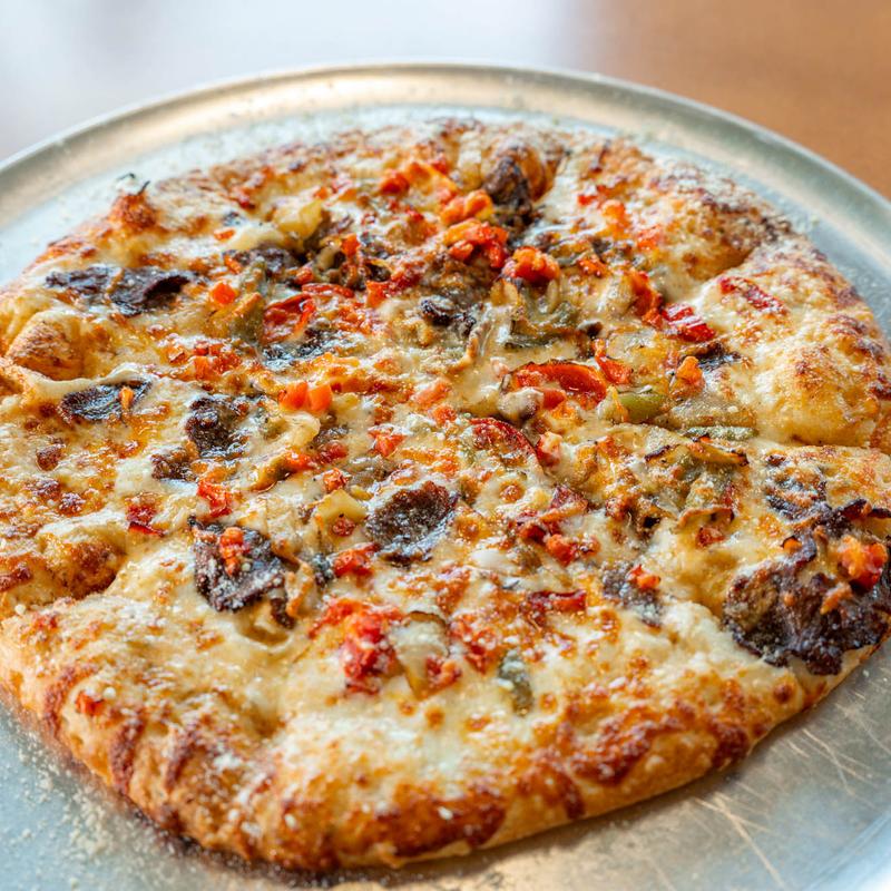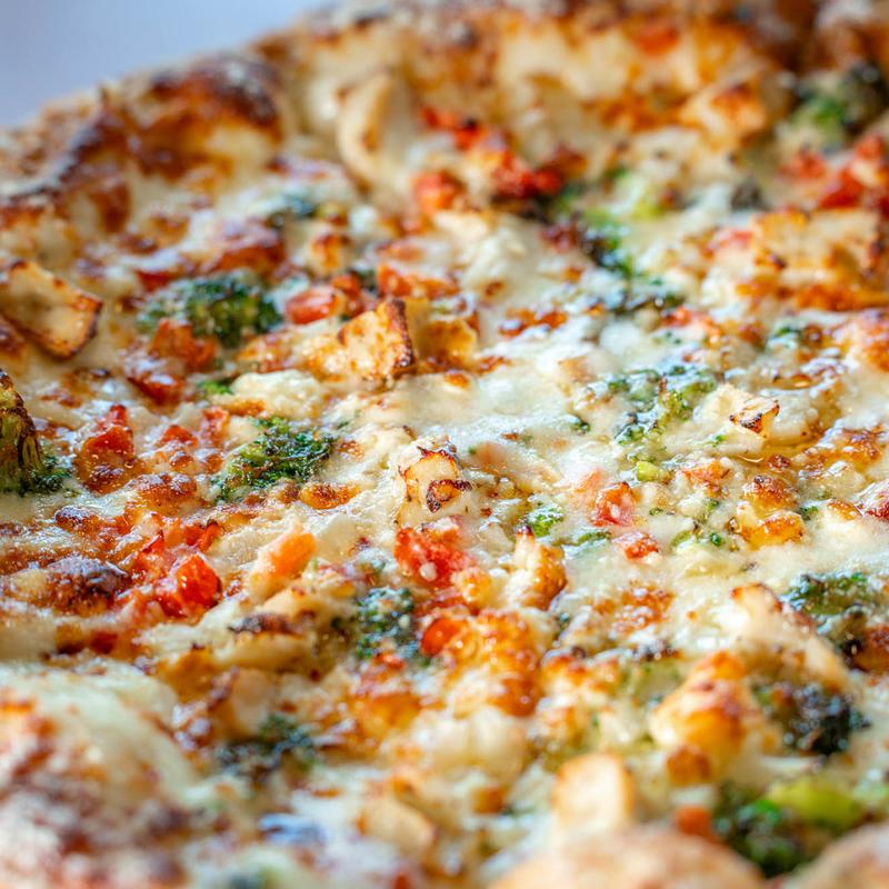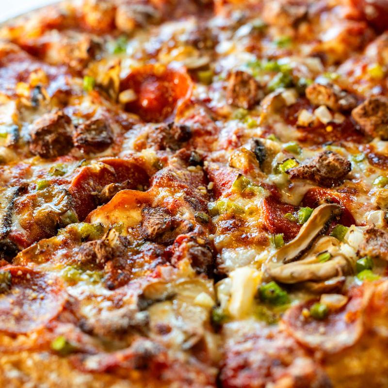 Toppings: Pepperoni, Italian Sausage, Ground Beef, Ham, Bacon, Chicken, Green Olives, Black Olives, Pineapple, Mushroom, Green Pepper, Banana Peppers, Jalapeño, Onion, Tomato, Roasted Onions and Peppers, Roasted Gar , Broccoli, Feta Cheese, Extra Cheese) • Crust choices: Thin Crust, Hand Tossed, Gluten Free (Small only, +$1.25) • +$1.00 additional charge for any all meat or supreme.